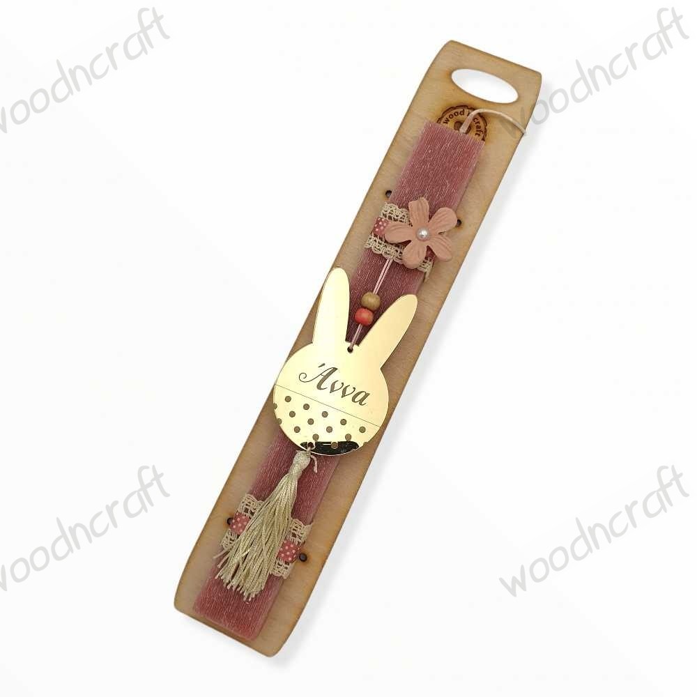 Πρωτότυπη χειροποίητη πασχαλινή λαμπάδα διακοσμημένη με κορδελάκια, λουλουδάκι με πέρλα και κρεμαστό διακοσμητικό κουνέλι φτιαγμένο από χρυσό καθρέφτη πλεξιγκλάς, χαραγμένο με το όνομα της επιλογής σας και στολισμένο με ξύλινες χάντρες και κρεμαστή φούντα.