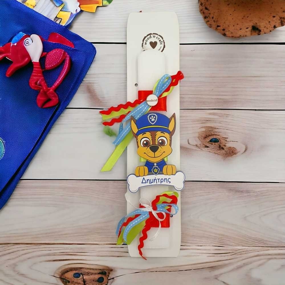 Πρωτότυπη χειροποίητη πασχαλινή λαμπάδα με ξύλινο διακοσμητικό το σκυλάκι Τσέις από το αγαπημένο παιδικό και προσαρμοσμένο το όνομα του παιδιού, σε σετ με πλάτη καδράκι, διακοσμημένη με πολύχρωμα κορδελάκια!