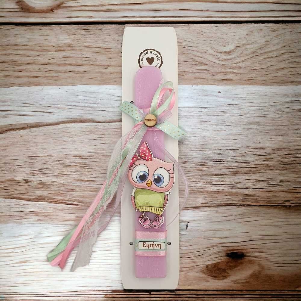 Πρωτότυπη χειροποίητη πασχαλινή λαμπάδα με ξύλινο διακοσμητικό μία γλυκύτατη μικρή κουκουβάγια, ταμπελάκι με το όνομα του παιδιού και πολύχρωμα κορδελάκια, σε σετ με πλάτη καδράκι!
