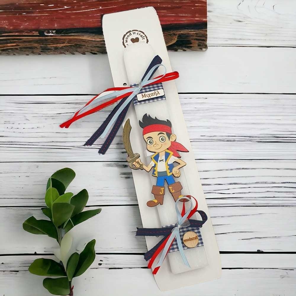 Πρωτότυπη χειροποίητη πασχαλινή λαμπάδα διακοσμημένη με κορδελάκια, ταμπελάκι με το όνομα του παδιού και την φιγούρα Τζέικ του πειρατή, προαιρετικά μπορεί να γίνει σετ με την πλάτη καδράκι.