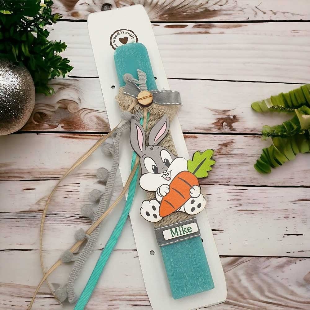 Πρωτότυπη χειροποίητη πασχαλινή λαμπάδα διακοσμημένη με κορδελάκια, ταμπελάκι με το όνομα του παδιού και την φιγούρα του baby bugs bunny, προαιρετικά μπορεί να γίνει σετ με την πλάτη καδράκι που απεικονίζει όλη την παρέα των baby looney tunes