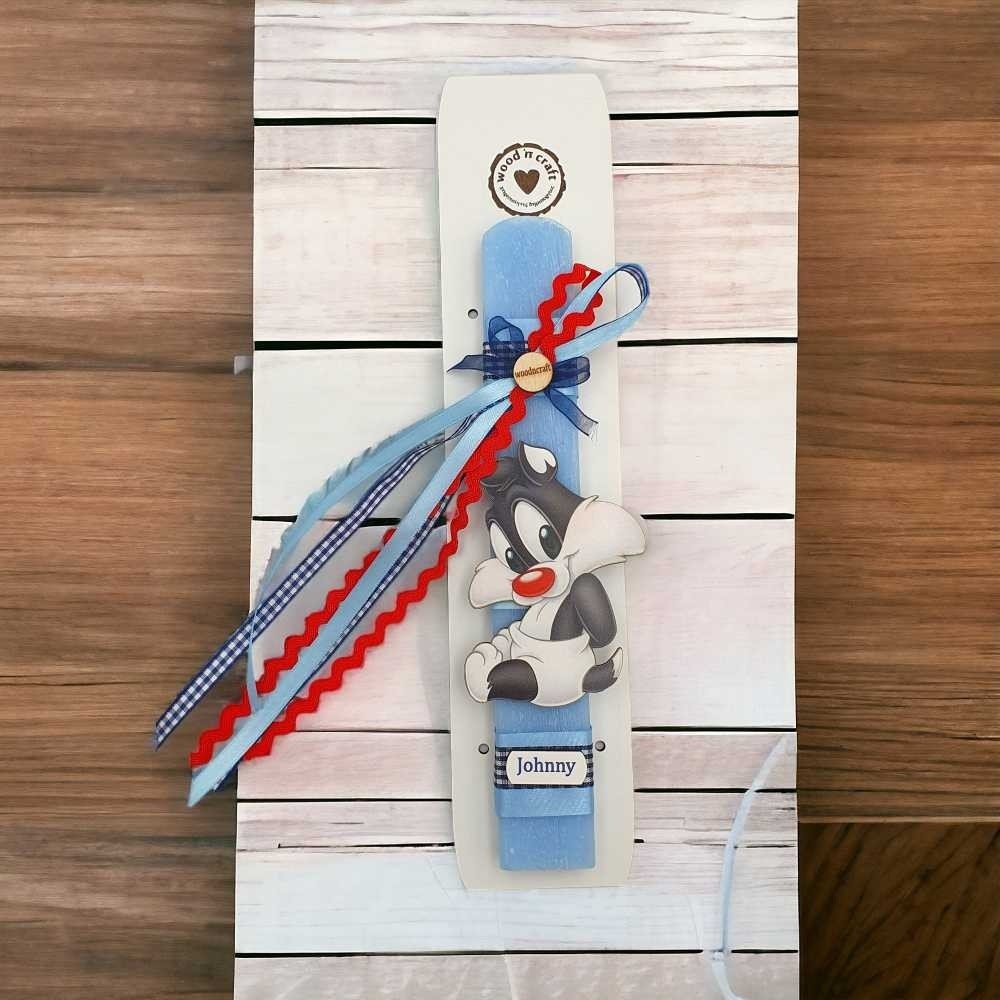 Πρωτότυπη χειροποίητη πασχαλινή λαμπάδα διακοσμημένη με κορδελάκια, ταμπελάκι με το όνομα του παδιού και την φιγούρα του μικρού silvester, προαιρετικά μπορεί να γίνει σετ με την πλάτη καδράκι που απεικονίζει όλη την παρέα των baby looney tunes