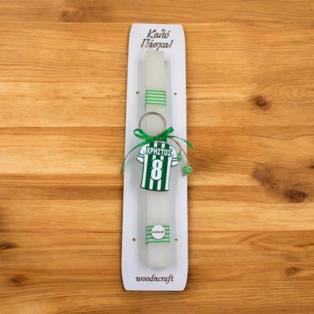 Η λαμπάδα είναι αρωματική, τετράγωνη (25 εκ.) και διακοσμημένη με ένα εντυπωσιακό μπρελόκ που φέρει τα χρώματα της αγαπημένης ομάδας και το όνομα του κατόχου της, προσθέτοντας μια προσωπική πινελιά.