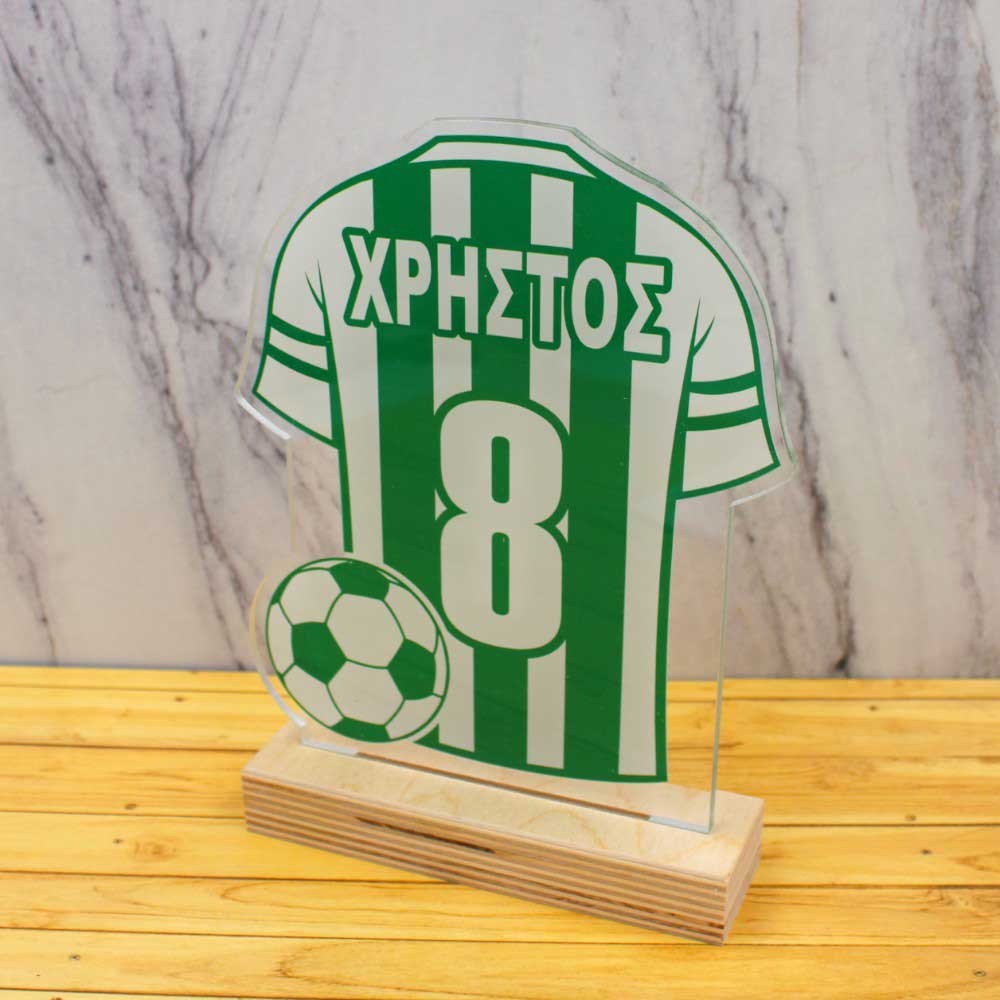 Συνοδεύεται από ένα εντυπωσιακό διακοσμητικό stand από πλεξιγκλάς (14x19,5 εκ.) πάνω σε ξύλινη βάση, με σχέδιο φανέλας και μπάλας ποδοσφαίρου, ιδανικό για να στολίζει το γραφείο ή το ράφι του νεαρού αθλητή.