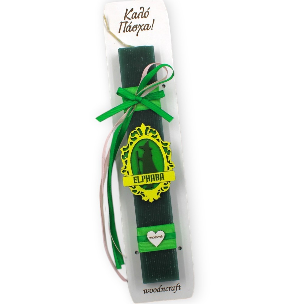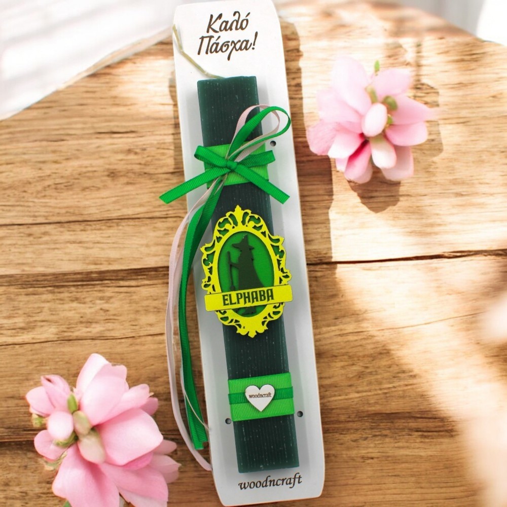 Σε σκούρο πράσινο χρώμα και με διαστάσεις 25 εκ., αυτή η πλακέ λαμπάδα είναι διακοσμημένη με κομψές κορδέλες σε πράσινο και ροζ, προσδίδοντας μια ιδιαίτερη αισθητική.