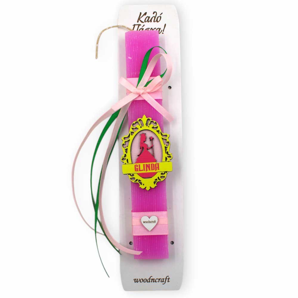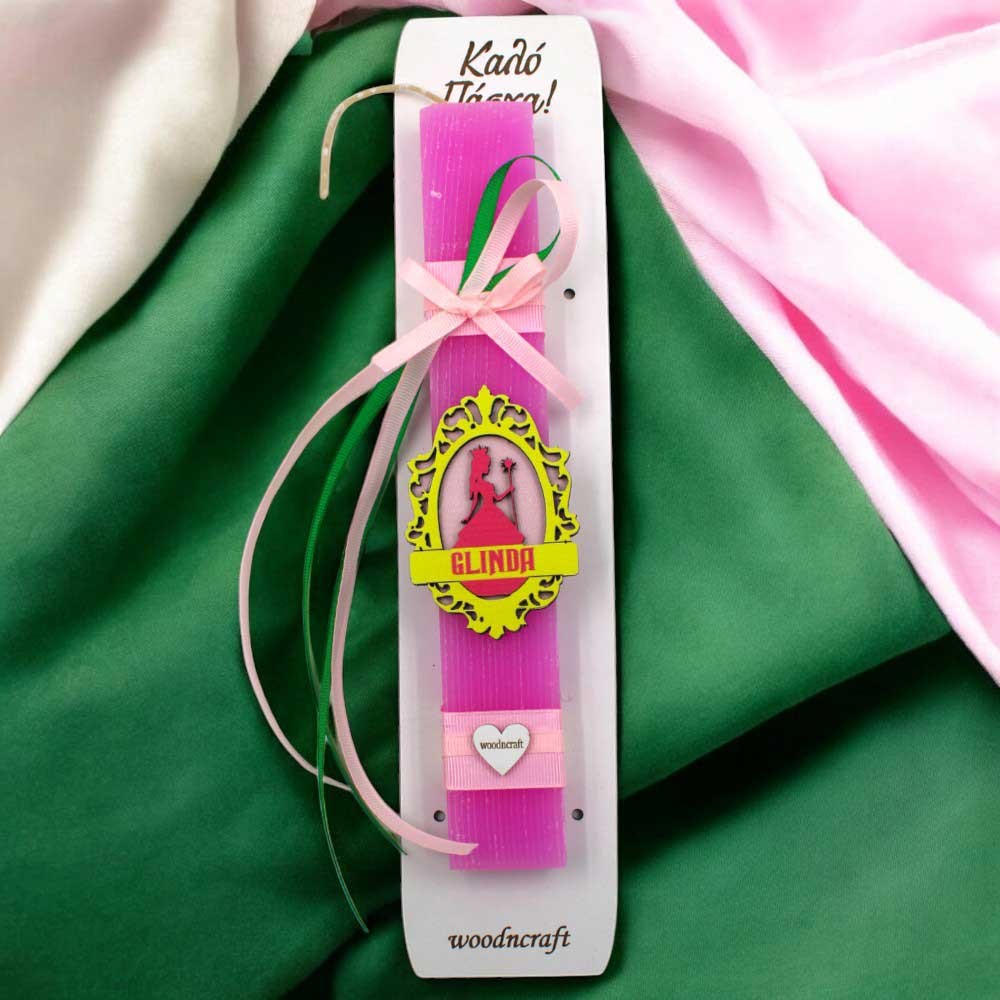 Σε υπέροχο ροζ χρώμα και με διαστάσεις 25 εκ., αυτή η πλακέ λαμπάδα είναι διακοσμημένη με κομψές κορδέλες σε ροζ και πράσινο, προσδίδοντας μια ιδιαίτερη αισθητική.