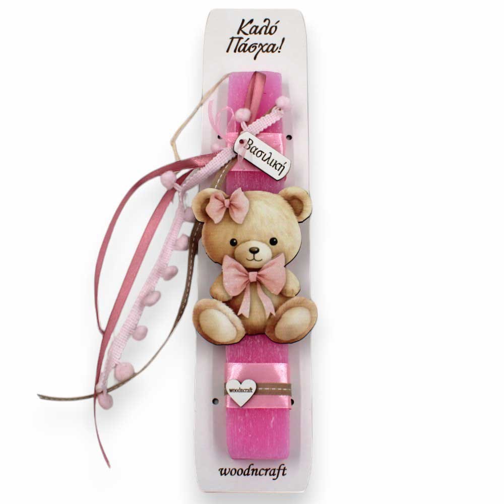 Η αρωματική, πλακέ λαμπάδα (25 εκ.) σε απαλές ροζ αποχρώσεις είναι στολισμένη με μια υπέροχη ξύλινη φιγούρα (10 εκ.) που απεικονίζει ένα γλυκό αρκουδάκι με φιόγκους!