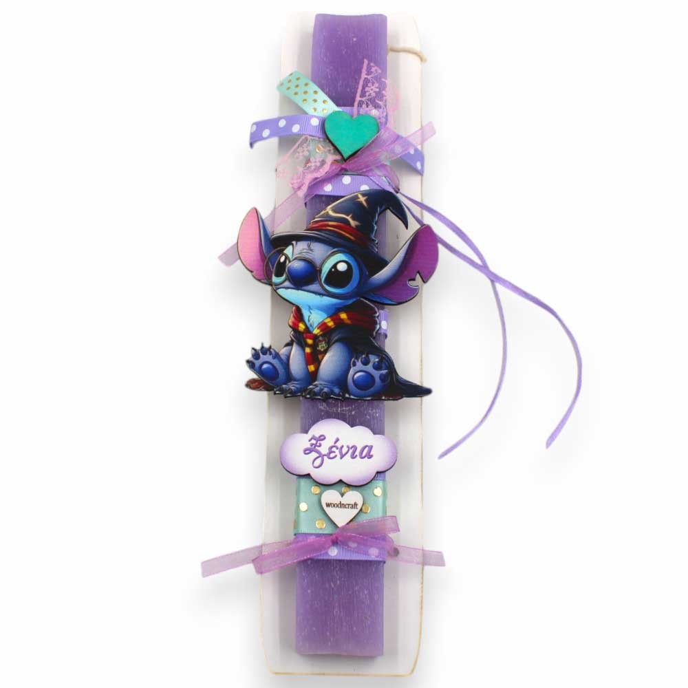 Στολισμένη με μια υπέροχη ξύλινη φιγούρα του αγαπημένου Στίτς ντυμένου μάγο (10 εκ.), εκτυπωμένη με UV για ζωντανά χρώματα και μεγάλη αντοχή, αυτή η λαμπάδα συνδυάζει φαντασία και παιδική μαγεία.