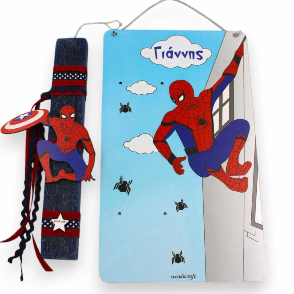 Πρωτότυπη χειροποίητη πασχαλινή λαμπάδα σε σετ με πλάτη που γίνεται καδράκι, διακοσμημένη με κορδελάκια, ξύλινη φιγούρα Spiderman με ασπίδα του Captain America και ταμπελάκι με το όνομα της επιλογής σας.