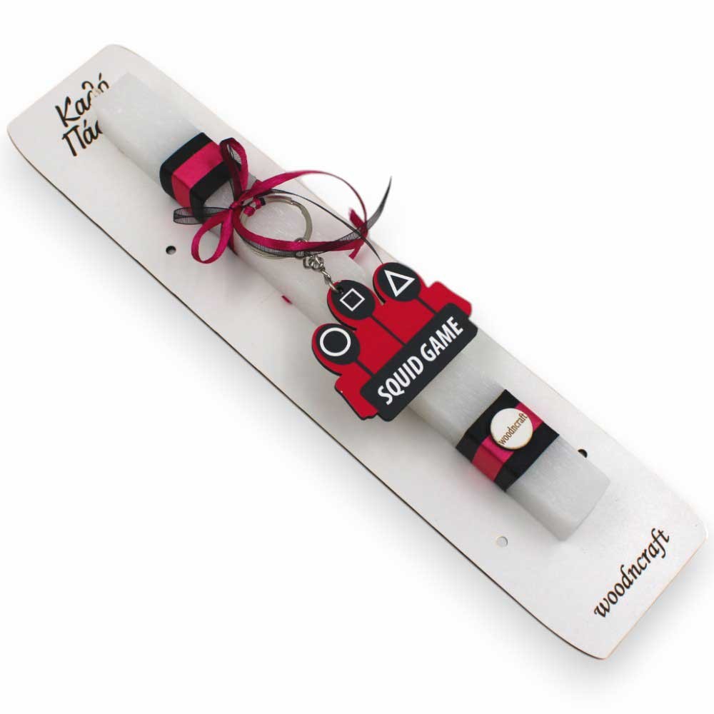 Μοναδική τετράγωνη αρωματική λαμπάδα 25 εκ., διακοσμημένη με ένα εντυπωσιακό ξύλινο μπρελόκ "Squid Game" με εκτύπωση UV.