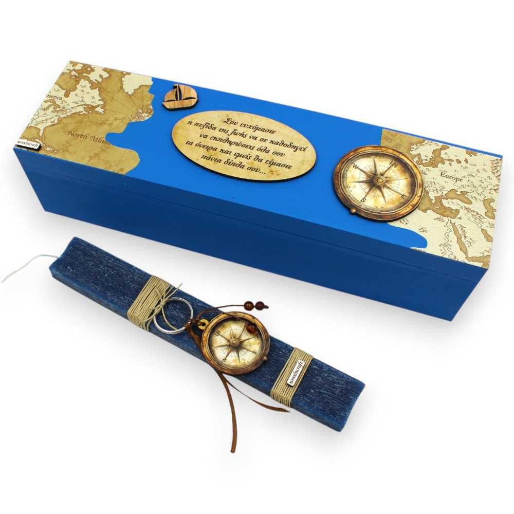 Συνοδεύεται από ξύλινο κουτί δώρου στο ίδιο θεματικό ύφος, διακοσμημένο με χάρτη, ξύλινα στοιχεία και πυξίδα, καθώς και ξύλινη ταμπέλα με χαραγμένη ευχή που παραπέμπει στο ταξίδι της ζωής.
