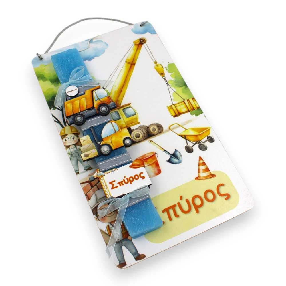 Η διακόσμηση περιλαμβάνει ξύλινα στοιχεία με UV εκτύπωση σε σχέδια φορτηγών, γερανού και εργαλείων εργοταξίου, δεμένα με κορδέλες σε απαλούς γαλάζιους και γκρι τόνους που δένουν αρμονικά με το θέμα.