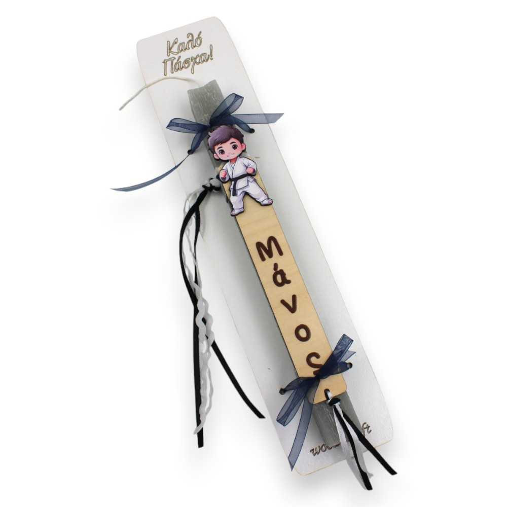 Τετράγωνη αρωματική πασχαλινή λαμπάδα μήκους 25 εκ., διακοσμημένη με ξύλινο σελιδοδείκτη και φιγούρα παιδιού αθλητή καράτε, ιδανική για ένα ξεχωριστό και προσωποποιημένο πασχαλινό δώρο.