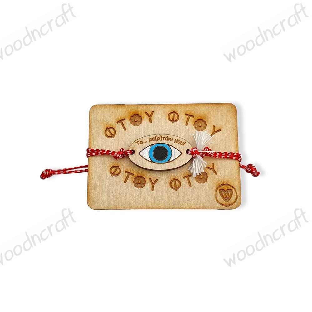 Πρωτότυπο χειροποίητο βραχιολάκι μαρτάκι.. στολισμένο με οβάλ ξύλινο στοιχείο, χαραγμένο ένα ματάκι και την φράση "Το μα(ρ)τάκι μου".