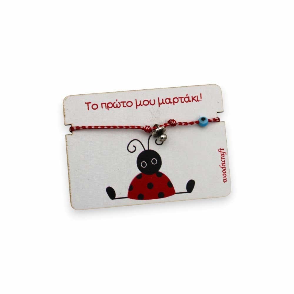 - Συσκευασία: Είναι τοποθετημένο σε μια όμορφη ξύλινη καρτέλα με εκτύπωση πασχαλίτσας, που συμβολίζει την τύχη, και τη φράση "Το πρώτο μου μαρτάκι!", ιδανικό για βρέφη και παιδιά.