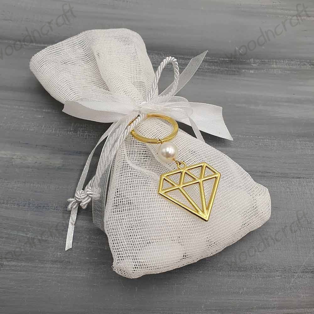 Πρωτότυπη χειροποίητη μπομπονιέρα βάφτισης με μεταλλικό μπρελόκ σε σχέδιο διαμάντι σε χρυσό χρώμα, με μία διακοσμητική πέρλα. Περιλαμβάνει πέντε κουφέτα αμυγδάλου περασμένα σε πουγκί γάζας δεμένο με κορδέλες και κορδόνι!