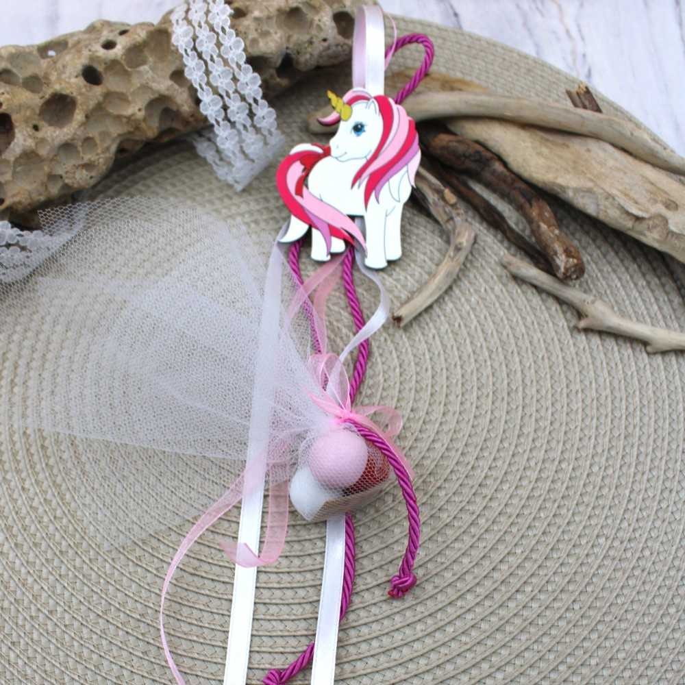 Χειροποίητη κρεμαστή μπομπονιέρα βάφτισης με ξύλινη φιγούρα μονόκερου βαμμένη στο χέρι!