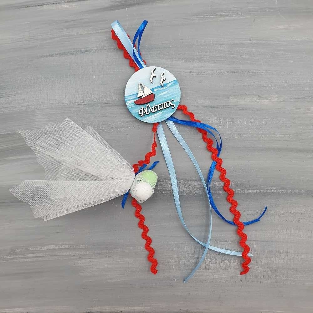 Αυτή η εξαιρετικά χειροποίητη μπομπονιέρα διακοσμείται με κομψά κορδελάκια και περιλαμβάνει ένα ξύλινο στρόγγυλο χειροποίητο μαγνητάκι διαμέτρου 6 εκατοστών. Το μαγνητάκι απεικονίζει μια ήρεμη θαλασσινή σκηνή με ένα μικρό καραβάκι και δύο πανέμορφους γλάρους, αποδίδοντας ένα ατμοσφαιρικό και θερινό σκηνικό.
