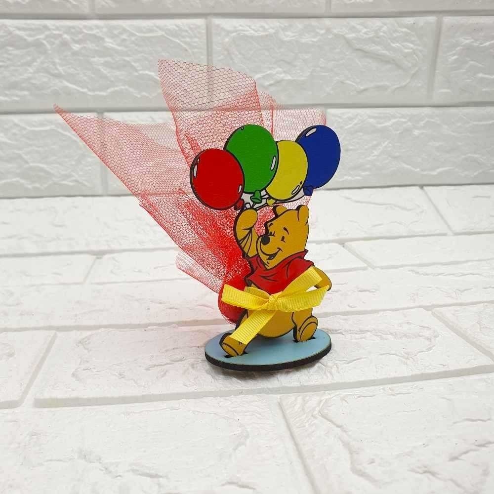 Πρωτότυπη χειροποίητη μπομπονιέρα βάφτισης σε βάση, με ξύλινη φιγούρα Γουίνι το αρκουδάκι με μπαλόνια στο χέρι! Περιέχει 3 κουφέτα της επιλογής σας σε κόκκινο τούλι, δεμένο με κορδέλα φιογκάκι!