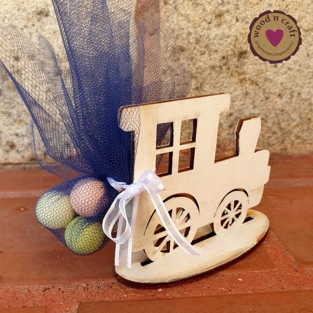 Πρωτότυπη χειροποίητη μπομπονιέρα βάφτισης με ξύλινο διακοσμητικό vintage τρενάκι σε βάση, με τρία κουφέτα της επιλογής σας σε μπλε σκούρο τούλι, δεμένο με κορδέλα φιογκάκι!
