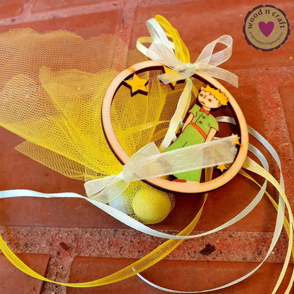 Χειροποίητη κρεμαστή μπομπονιέρα βάφτισης με ξύλινο στεφανάκι με προσαρμοσμένα αστεράκια και την φιγούρα του αγαπημένου Μικρού πρίγκηπα! Μία ξεχωριστή μπομπονιέρα βάφτισης διακοσμημένη με κορδελάκια, και κίτρινο τούλι που περιέχει τρία κουφέτα της επιλογής σας!