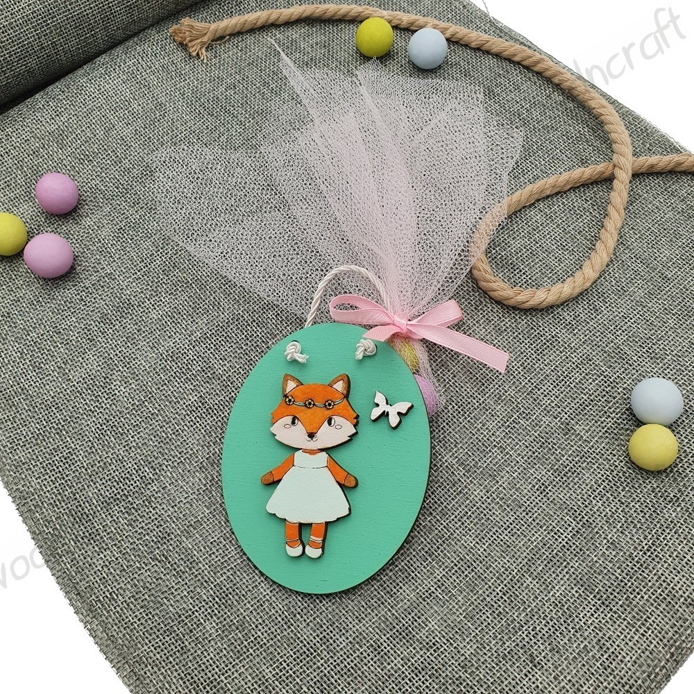 Χειροποίητη μπομπονιέρα βάφτισης με ξύλινο διακοσμητικό οβάλ καδράκι με μια χαριτωμένη αλεπουδίτσα με φουστάνι και μία πεταλούδα. Περιέχει τρία κουφέτα της επιλογής σας, δεμένα σε τούλι με κορδελάκι!