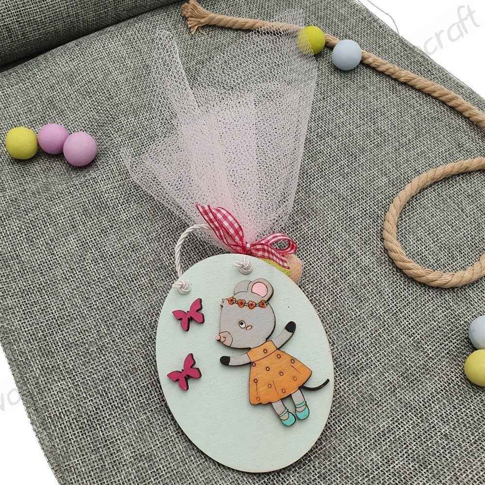 Χειροποίητη μπομπονιέρα βάφτισης με ξύλινο διακοσμητικό οβάλ καδράκι με μια χαριτωμένη ποντικίνα με φουστάνι και δύο πεταλούδες. Περιέχει τρία κουφέτα της επιλογής σας, δεμένα σε τούλι με κορδελάκι!