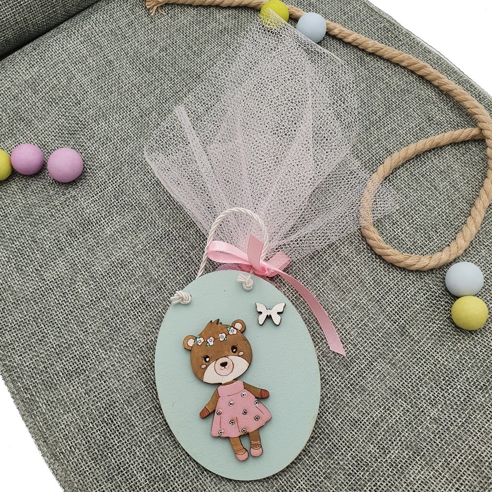 Χειροποίητη μπομπονιέρα βάφτισης με ξύλινο διακοσμητικό οβάλ καδράκι με μια χαριτωμένη αρκουδίτσα με φουστάνι και μία πεταλούδα. Περιέχει τρία κουφέτα της επιλογής σας, δεμένα σε τούλι με κορδελάκι!