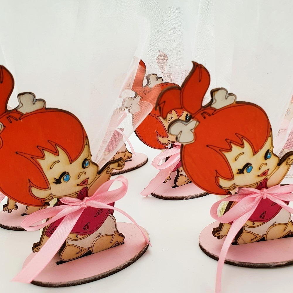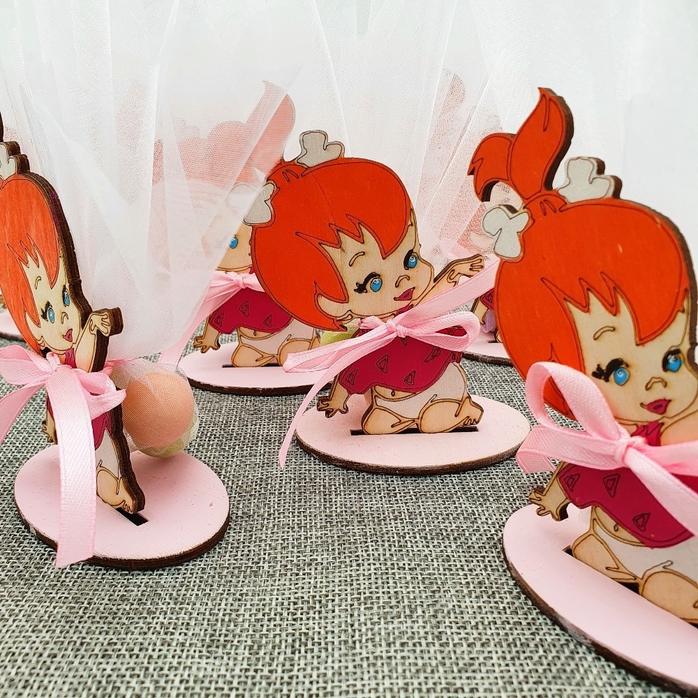 Η Επιτραπέζια Μπομπονιέρα - Σταλίτσα είναι μια χαριτωμένη χειροποίητη δημιουργία για τη βάπτιση, με ξύλινη φιγούρα της Σταλίτσας από τους Flinstones. Το διακοσμητικό είναι κατασκευασμένο με UV εκτύπωση, προσφέροντας ζωντανά χρώματα και μπορεί να προσαρμοστεί στις αποχρώσεις που ταιριάζουν με το θέμα της εκδήλωσης. Η μπομπονιέρα είναι διακοσμημένη με κορδελάκι και περιλαμβάνει τρία κουφέτα της επιλογής σας (πολύχρωμα crispy ή λευκά αμυγδάλου), τα οποία είναι περασμένα σε τούλι.