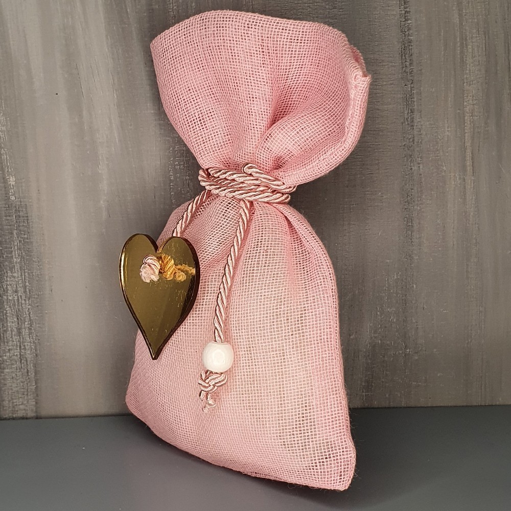 Πρωτότυπη χειροποίητη μπομπονιέρα βάφτισης σε χρωματιστό πουγκάκι γάζας, που διακοσμείται με ροζ σχοινάκι και μία καρδούλα από χρυσό πλεξιγκλάς!