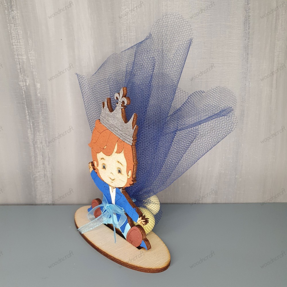 Η Επιτραπέζια Μπομπονιέρα - Πρίγκιπας είναι μια μοναδική και χειροποίητη δημιουργία που θα κλέψει τις εντυπώσεις στη βάφτιση. Η ξύλινη φιγούρα ενός μικρού πρίγκιπα είναι τοποθετημένη σε σταθερή βάση, προσφέροντας ένα διακοσμητικό που οι καλεσμένοι σας θα λατρέψουν. Το ξύλινο διακοσμητικό έχει ύψος 10 cm και συνδυάζεται άψογα με τρία κουφέτα της επιλογής σας (πολύχρωμα crispy ή λευκά αμυγδάλου), τυλιγμένα σε τούλι και δεμένα με κορδελάκι.