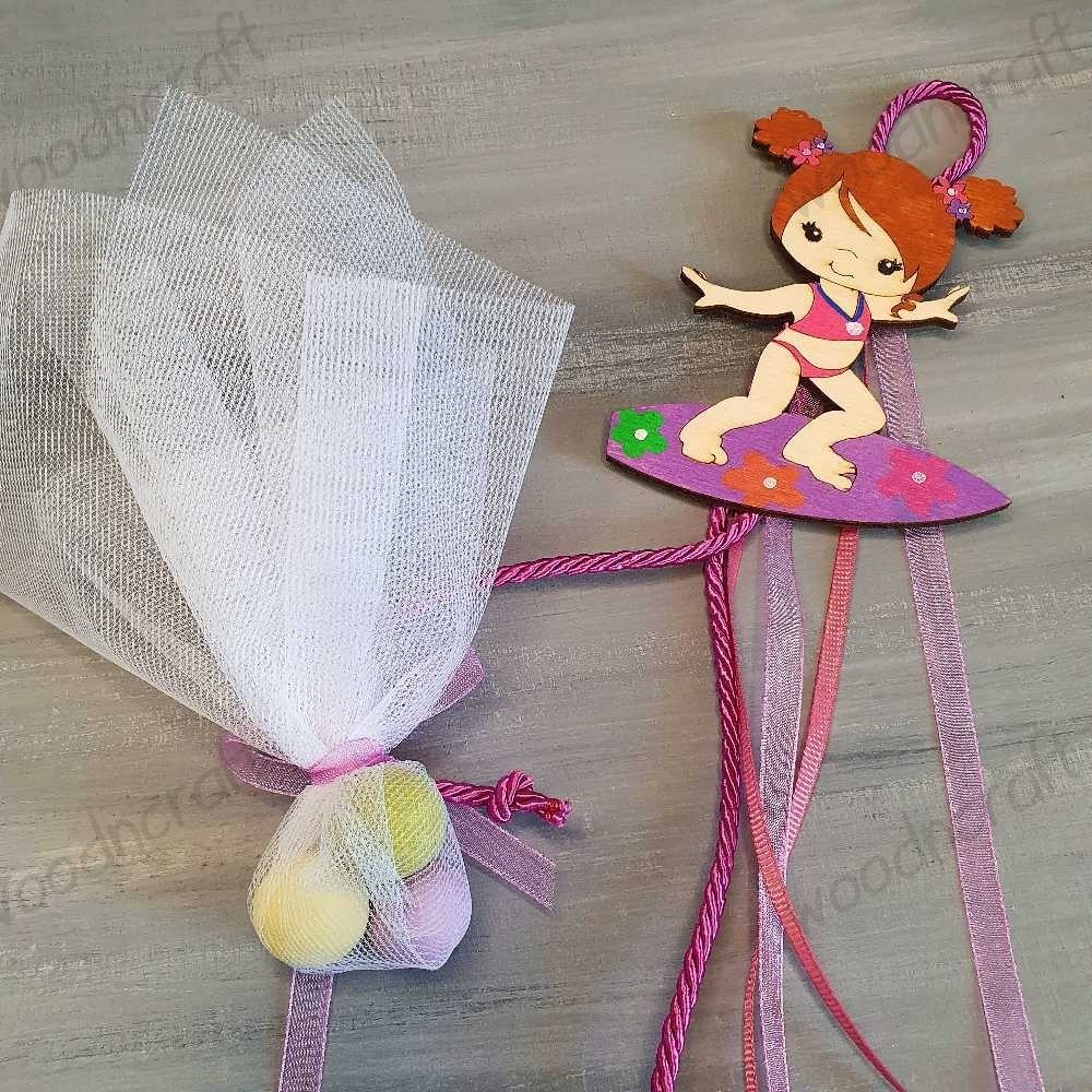 Πρωτότυπη χειροποίητη κρεμαστή μπομπονιέρα βάφτισης διακοσμημένη με ξύλινο στοιχείο κοριτσάκι σε σανίδα για σερφ, σχοινί και κορδελάκια επιλεγμένα να ταιριάζουν στα χρώματα της δικής σας βάφτισης! Ιδανική μπομπονιέρα για την πιο δροσερή καλοκαιρινή βάφτιση!