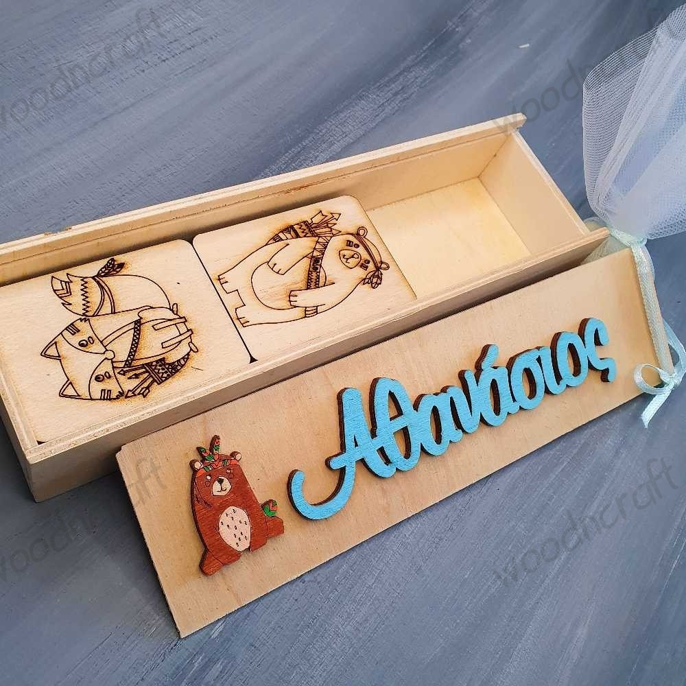Μοναδική χειροποίητη παιδική μπομπονιέρα βάφτισης με παιχνίδι μνήμης σε ξύλινη κασετίνα με θέμα Έθνικ ζωάκια! Η κασετίνα είναι διακοσμημένη με το όνομα του παιδιού και ένα γλυκό αρκουδάκι και περιέχει έξι ζευγάρια ζώων χαραγμένα σε ξύλινες κάρτες. Συνοδεύεται από μπομπονιέρα που περιέχει 3 κουφέτα της επιλογής σας δεμένα σε τούλι!