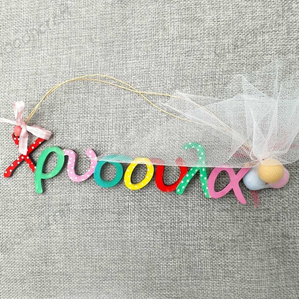 Μοναδική χειροποίητη παιδική μπομπονιέρα βάφτισης με ξύλινο κρεμαστό πολύχρωμο όνομα διακοσμημένο με χάντρα και κορδελάκι! Περιέχει 3 κουφέτα της επιλογής σας δεμένα σε τούλι!