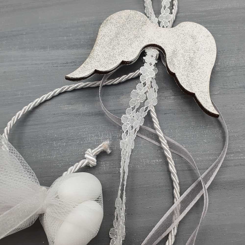 Πρωτότυπη χειροποίητη κρεμαστή μπομπονιέρα βάφτισης διακοσμημένη με κορδόνι, κορδελάκια και ξύλινο στοιχείο φτερά με προσθήκη ασημόσκονης!