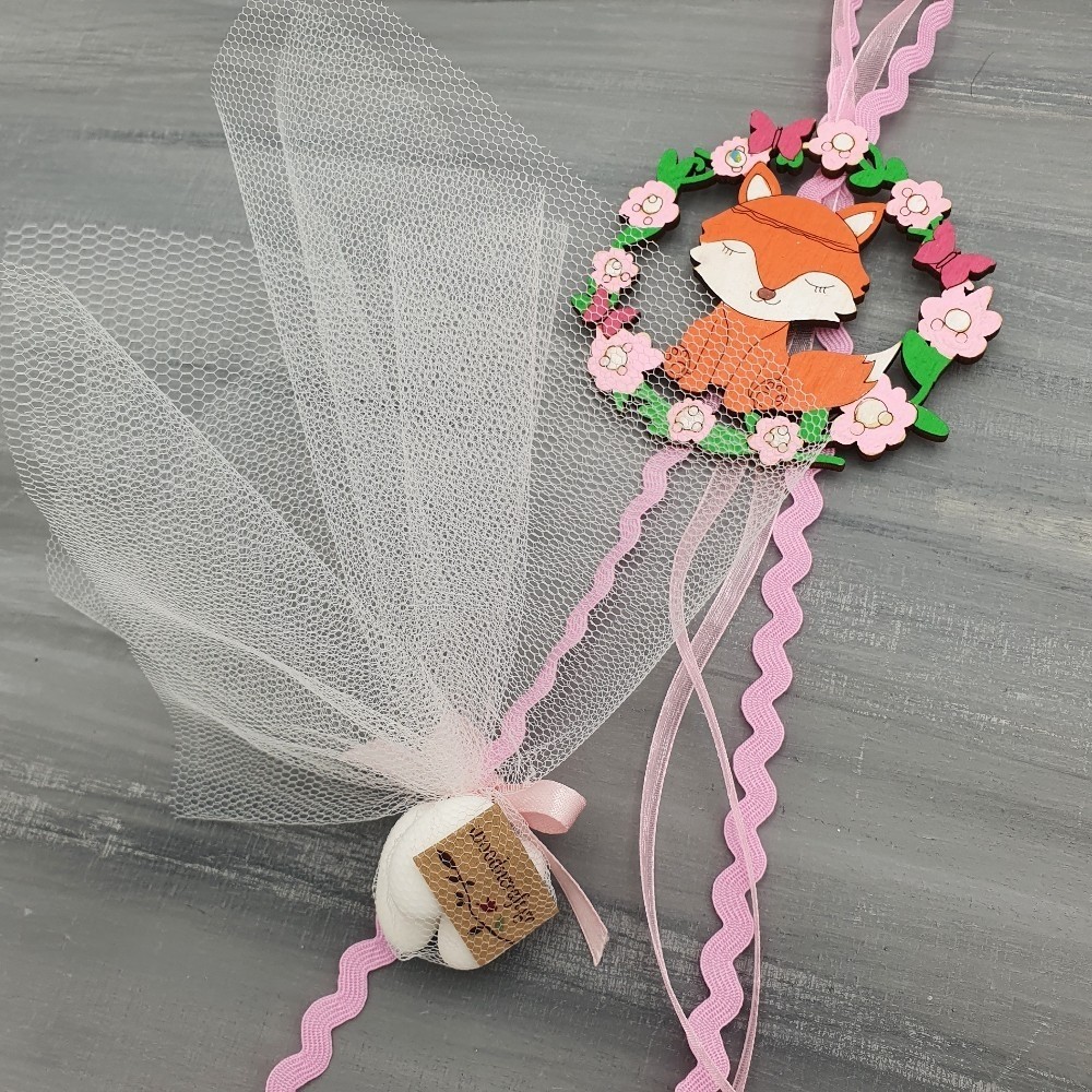 Πρωτότυπη χειροποίητη κρεμαστή μπομπονιέρα βάφτισης διακοσμημένη με κορδελάκια και ξύλινο διακοσμητικό, λουλουδάτο στεφανάκι, με προσαρμοσμένη μια αλεπουδίτσα στο εσωτερικό του.