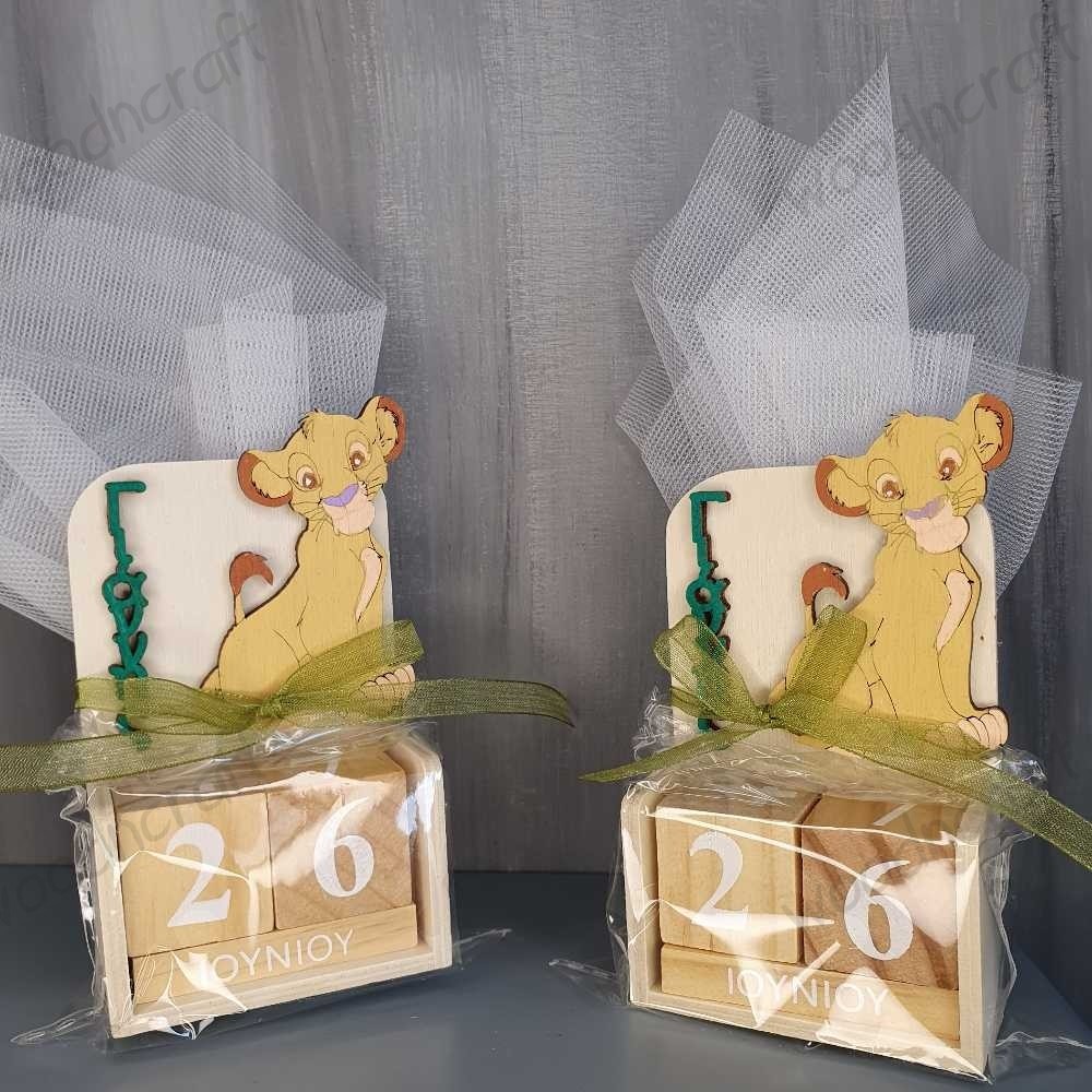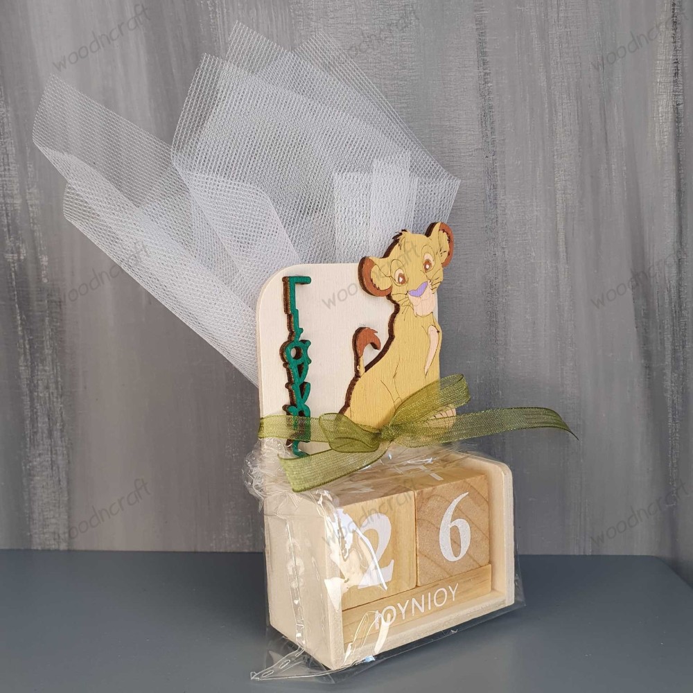 Μοναδική χειροποίητη μπομπονιέρα βάφτισης με ξύλινο ημερολόγιο κυβάκια, διακοσμημένο με το όνομα της επιλογής σας και ξύλινη φιγούρα λιονταράκι Σίμπα. Η μπομπονιέρα περιέχει 3 κουφέτα της επιλογής σας δεμένα σε τούλι με κορδελάκι!
