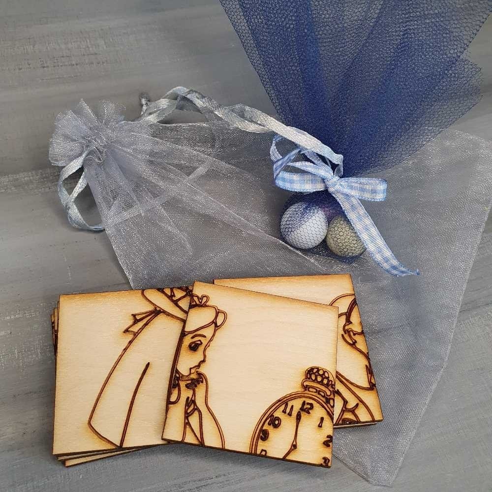 Μοναδική χειροποίητη παιδική μπομπονιέρα βάφτισης με ξύλινο παζλ 9 κομματιών σε θέμα Αλίκη στην χώρα των θαυμάτων περασμένο σε πουγκάκι. Η μπομπονιέρα διακοσμείται με κορδελάκι και περιέχει 3 κουφέτα της επιλογής σας δεμένα σε χρωματιστό τούλι! Το αγαπημένο παιχνίδι μικρών και μεγάλων έτοιμο να προσθέσει την πιο ξεχωριστή πινελιά στη διακόσμηση της βάπτισης!