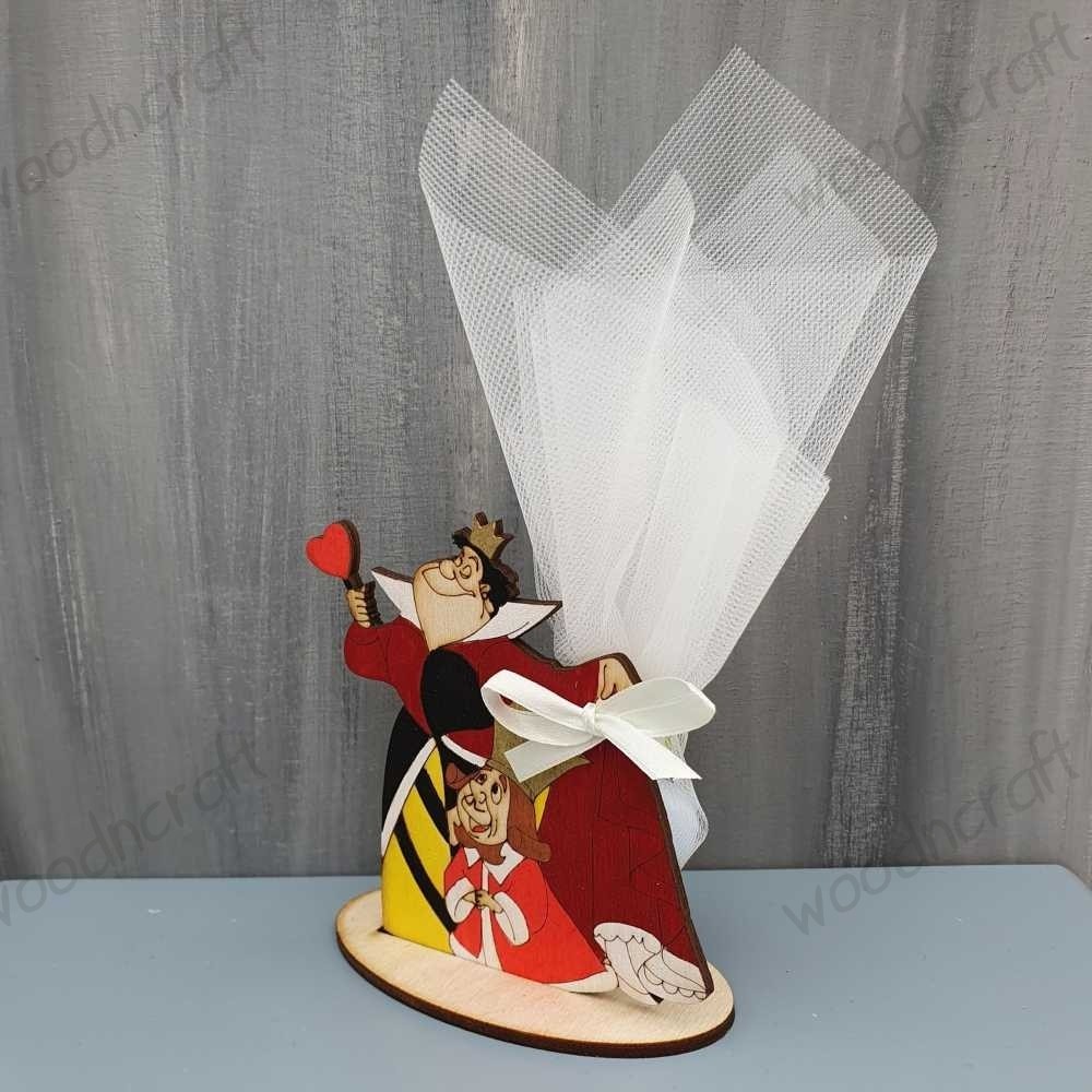 Χειροποίητη επιτραπέζια μπομπονιέρα βάφτισης με ξύλινη φιγούρα με την ντάμα και τον ρήγα κούπα, ήρωες από το αγαπημένο παραμύθι Αλίκη στην χώρα των θαυμάτων! Σε χρώματα της επιλογής σας και διακοσμημένη με κορδελάκι. Περιέχει 3 κουφέτα της επιλογής σας.