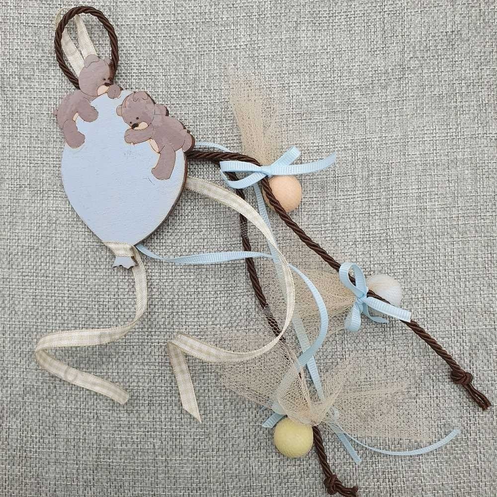 Χειροποίητη ξύλινη κρεμαστή μπομπονιέρα βάφτισης με διακοσμητική φιγούρα δύο αρκουδάκι πάνω σε ένα μπαλόνι , σχοινί, κορδέλες και τρία κουφέτα δεμένα ξεχωριστά με φιογκάκι!