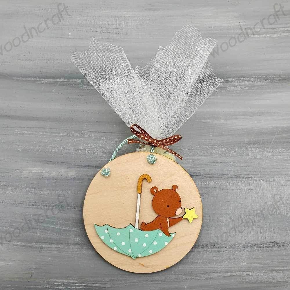 Χειροποίητη μπομπονιέρα βάφτισης με ξύλινο διακοσμητικό οβάλ καδράκι, με ένα αρκουδάκι πάνω σε ομπρέλα! Διακοσμημένο με κορδέλα δεμένη σε λευκό τούλι! Στα χρώματα της επιλογής σας!