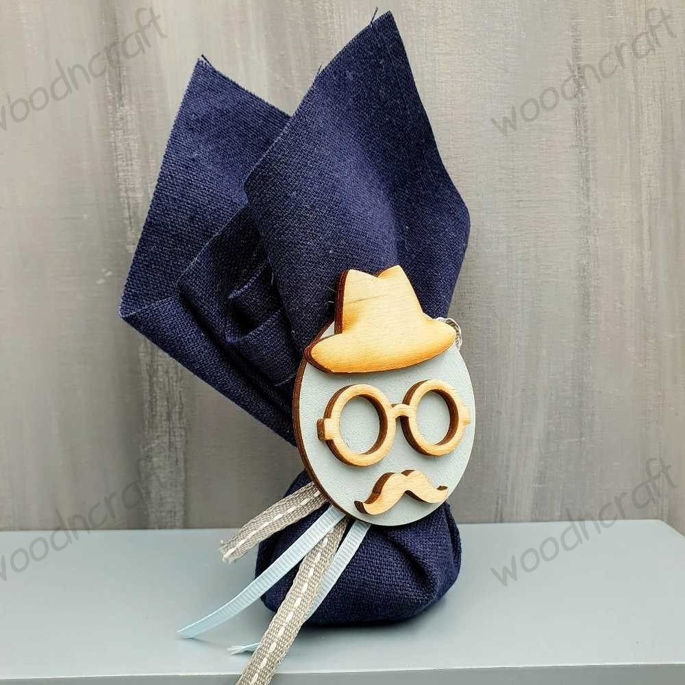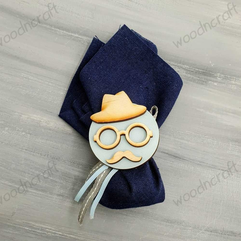 Πρωτότυπη χειροποίητη μπομπονιέρα βάφτισης με φιγούρα καπέλο, γυαλιά και μουστάκι επάνω σε στρογγυλό μαγνητάκι. Περιλαμβάνει πέντε κουφέτα της επιλογής σας περασμένα σε μπλε μαντήλι, δεμένο με κορδελάκια!