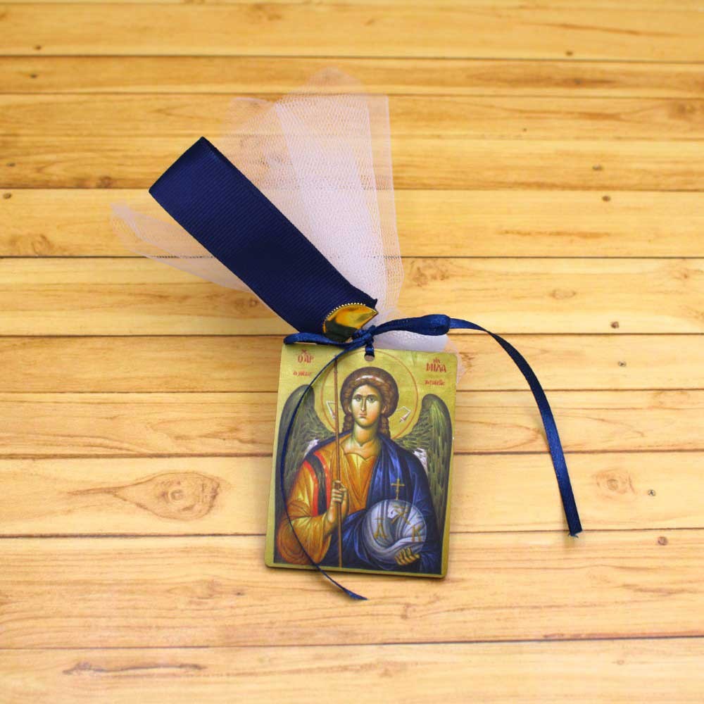Κομψή κρεμαστή μπομπονιέρα βάπτισης με την εικόνα του Αρχάγγελου Μιχαήλ, ιδανική για μια ξεχωριστή και παραδοσιακή τελετή.