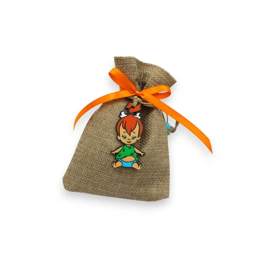 Μπομπονιέρα για βάπτιση ή κέρασμα γέννας σε λινάτσα πουγκί, διακοσμημένη με πορτοκαλί σατέν κορδέλα και ξύλινο μπρελόκ 6 εκ. με τη λατρεμένη Σταλίτσα από τους Φλίνστοουνς.