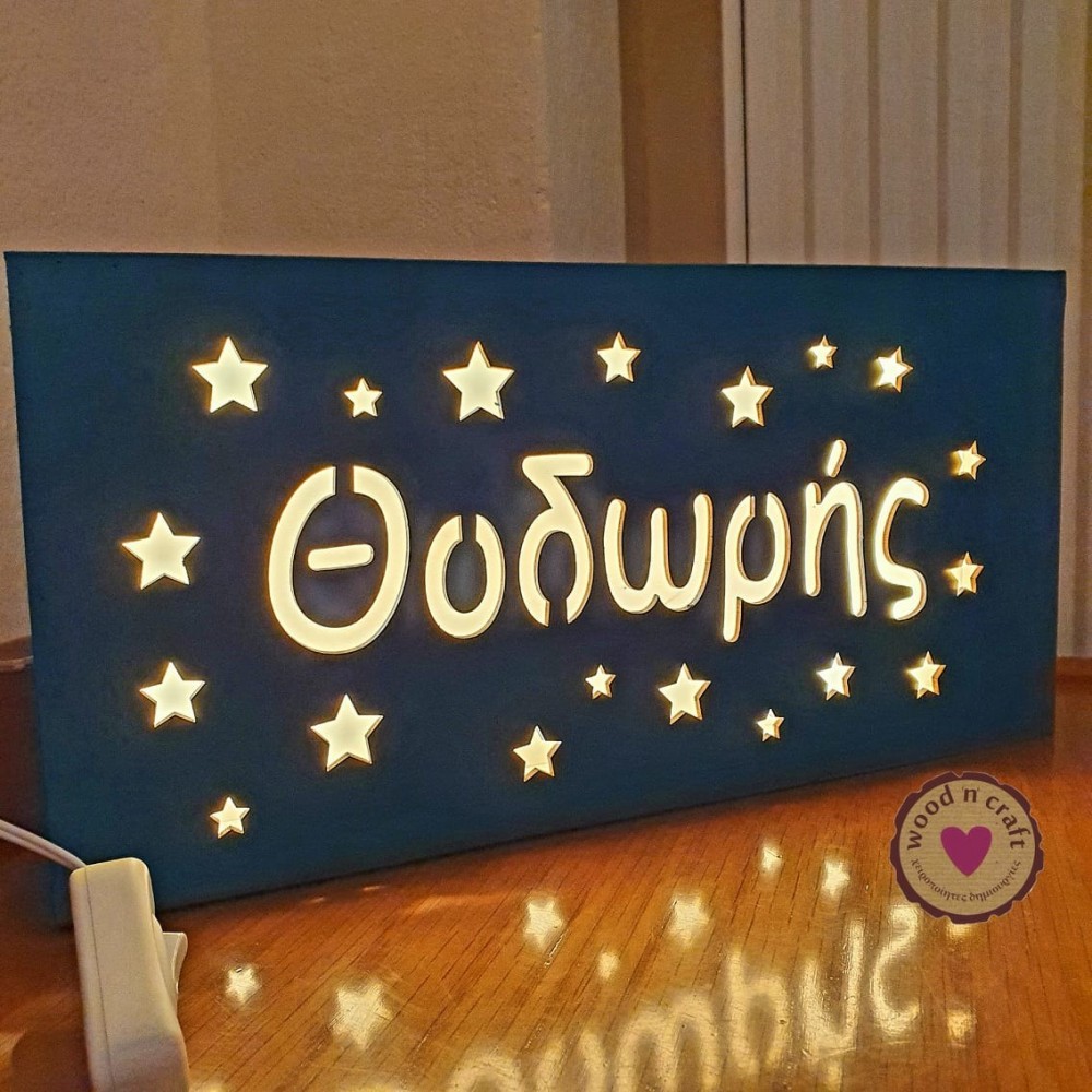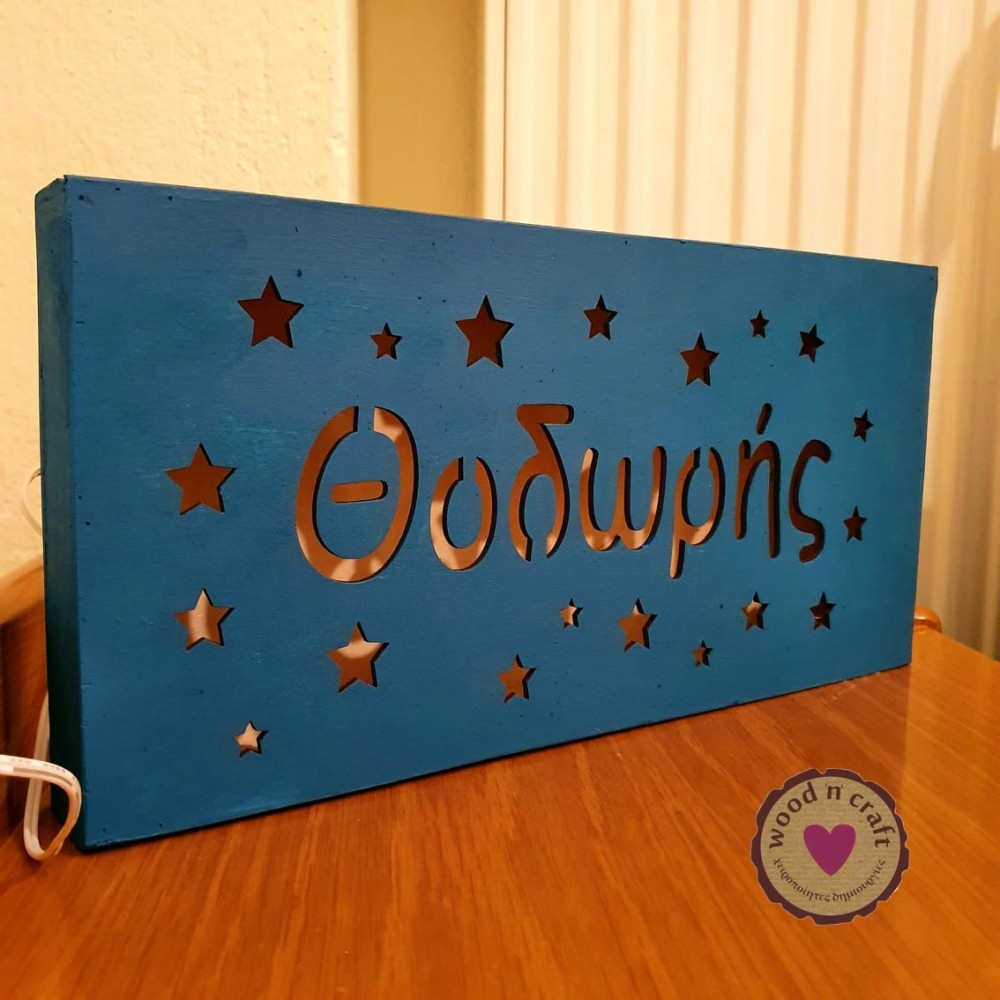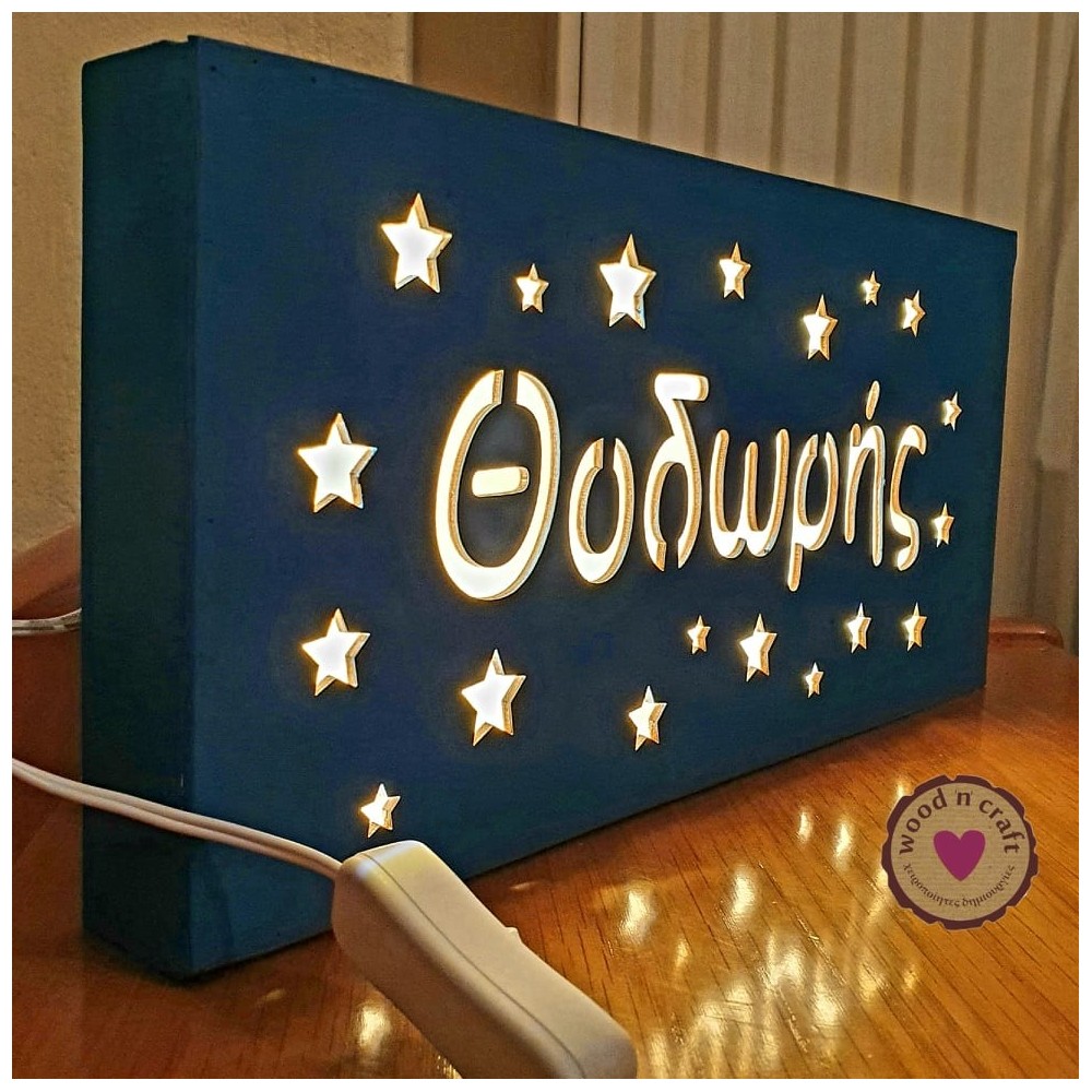 Ξύλινο χειροποίητο επιτραπέζιο φωτιστικό υψηλής αισθητικής με θέμα ταξίδι σε μια νύχτα μαγική... γεμάτη πολλά πολλά αστεράκια! Ένα μοναδικό φωτιστικό βαμμένο σε χρώματα που ταιριάζουν με την διακόσμησή σας και προσωποποιημένο με το όνομα της επιλογής σας!