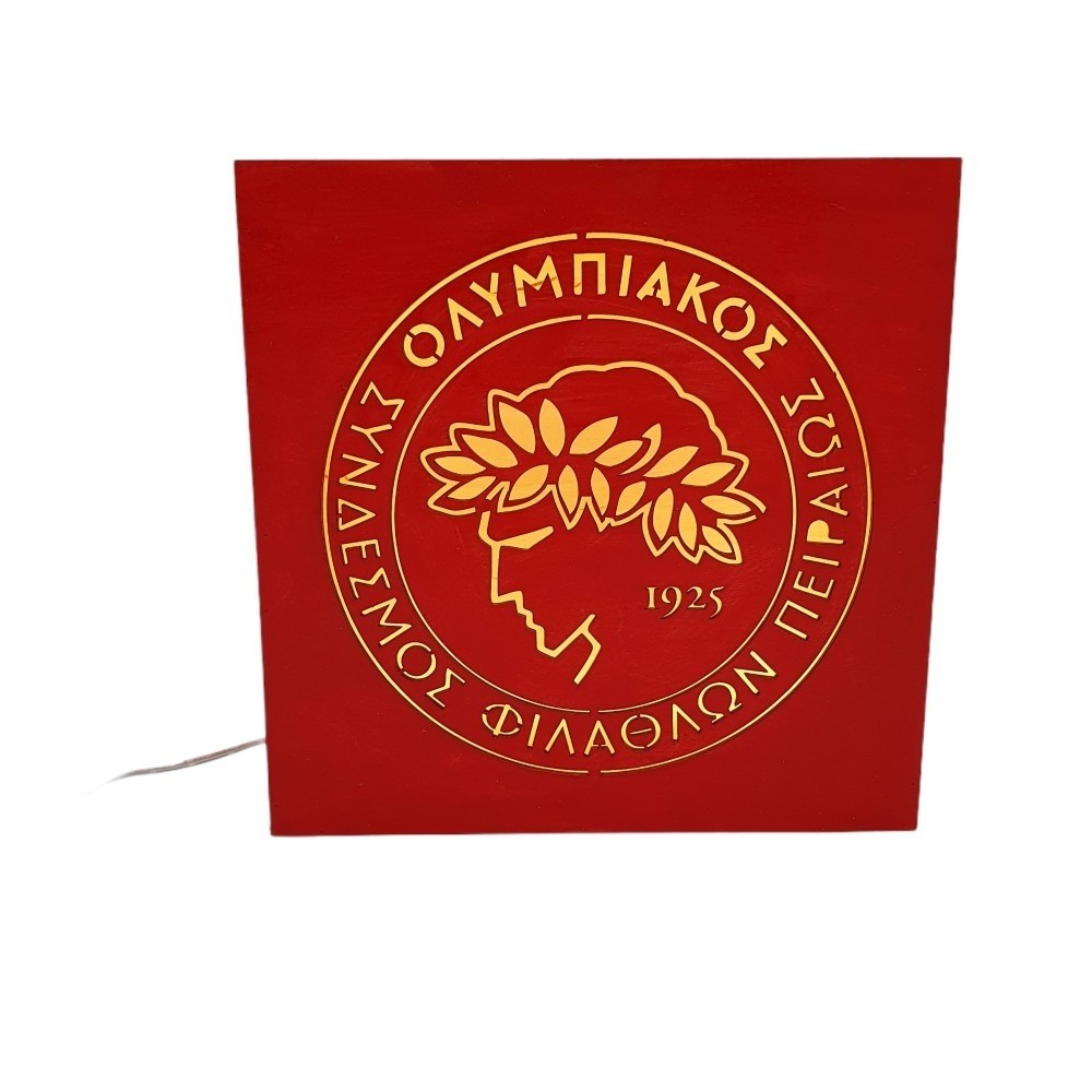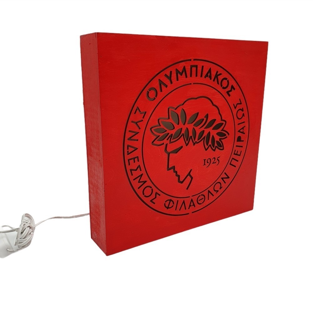 Ξύλινο χειροποίητο επιτραπέζιο φωτιστικό υψηλής αισθητικής με το λογότυπο της ομάδας του Ολυμπιακού! Ένα μοναδικό φωτιστικό της αγαπημένη σας ομάδας !!
