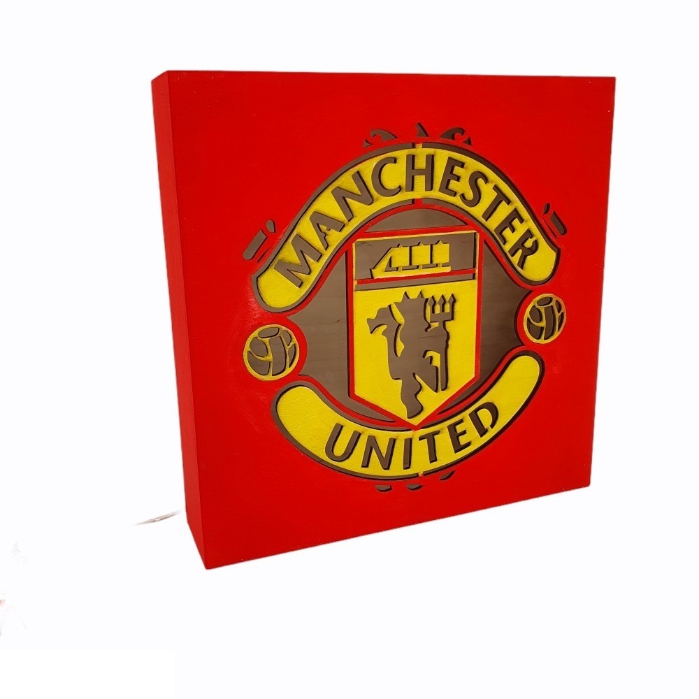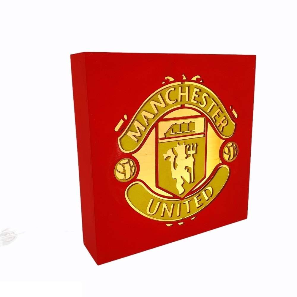 Ξύλινο χειροποίητο επιτραπέζιο φωτιστικό υψηλής αισθητικής με το λογότυπο της ομάδας της Manchester United! Ένα μοναδικό φωτιστικό της αγαπημένη σας ομάδας!!