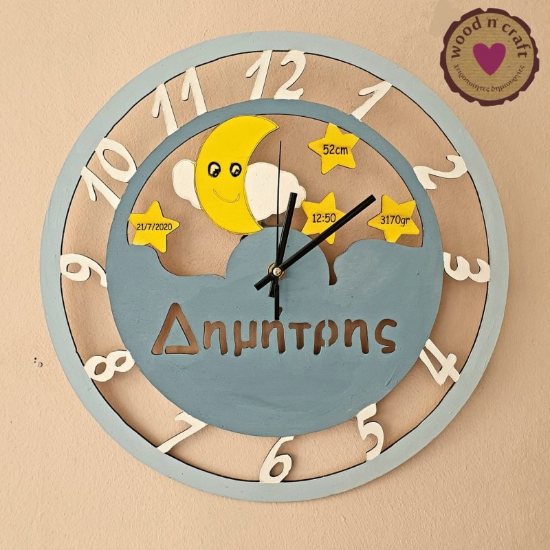Μοναδικό ξύλινο χειροποίητο παιδικό ρολόι τοίχου με αστεράκια που έχουν χαραγμένα τα στοιχεία γέννησης του παιδιού και ένα φεγγαράκι μέσα στα σύννεφα. Ένα ιδιαίτερο ρολόι σε στρόγγυλο σχήμα που περιμετρικά του έχουν προσαρμοστεί οι αριθμοί της ώρας, στο κέντρο του η αναπαράσταση του ουρανού και από κάτω το όνομα του παιδιού! Βάφεται σε χρώματα της επιλογής σας.