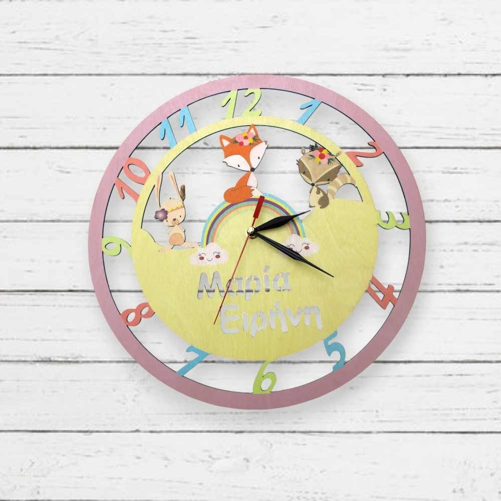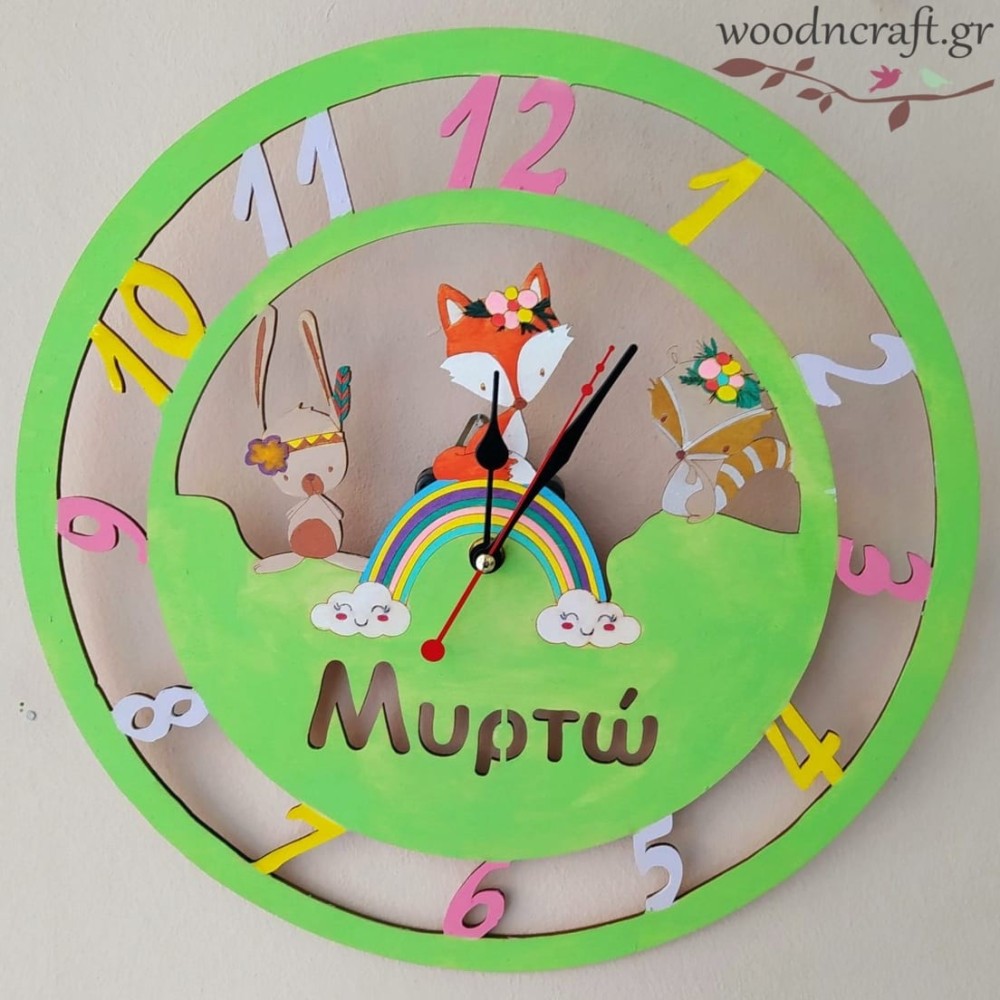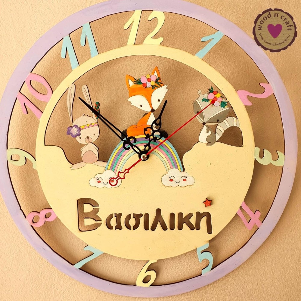 Μοναδικό ξύλινο χειροποίητο παιδικό ρολόι τοίχου με θέμα τα αγαπημένα boho ζωάκια! Ένα ιδιαίτερο ρολόι σε στρόγγυλο σχήμα που περιμετρικά του έχουν προσαρμοστεί οι αριθμοί της ώρας, στο κέντρο του μια αναπαράσταση με ζωάκια boho, ένα ουράνιο τόξο και από κάτω το όνομα του παιδιού!