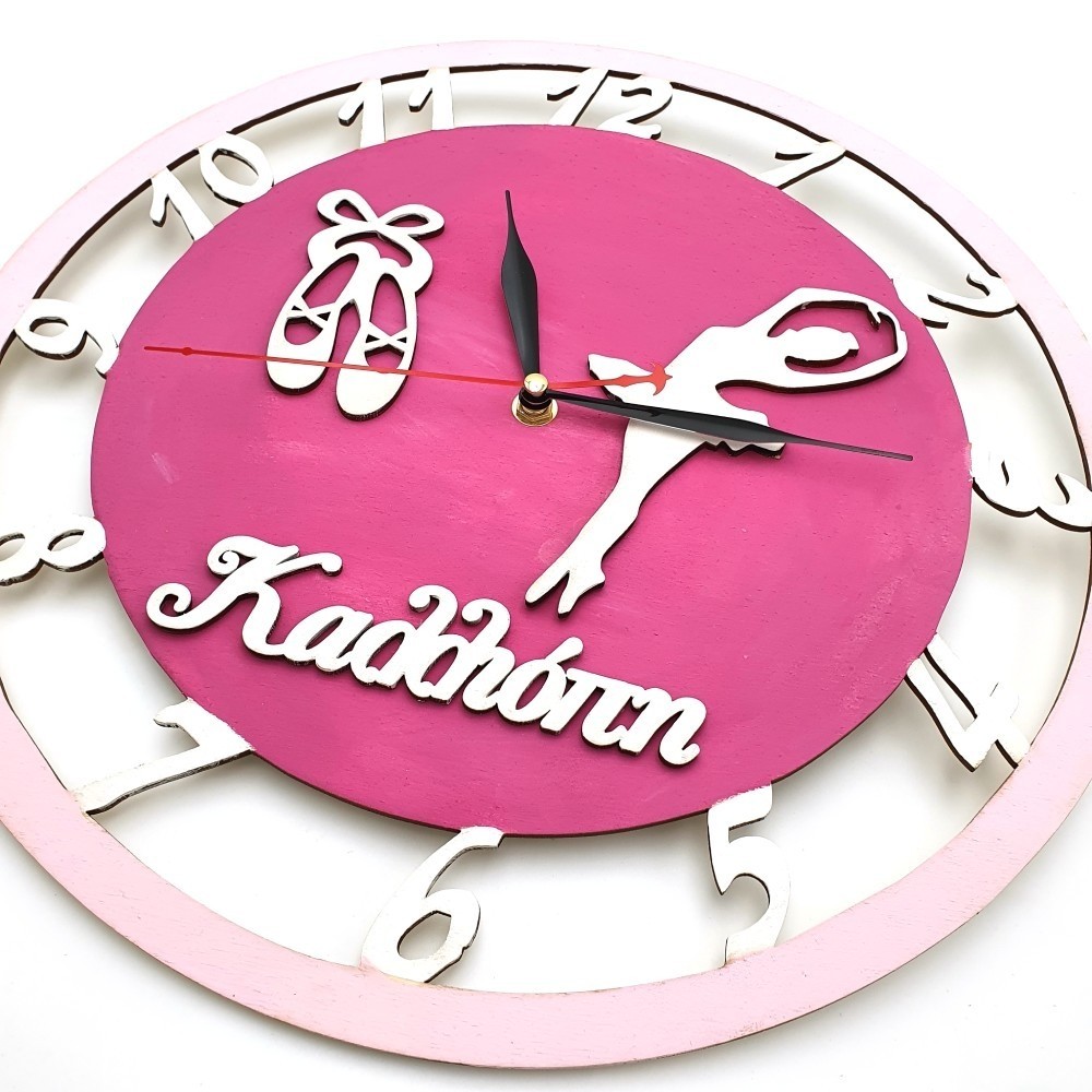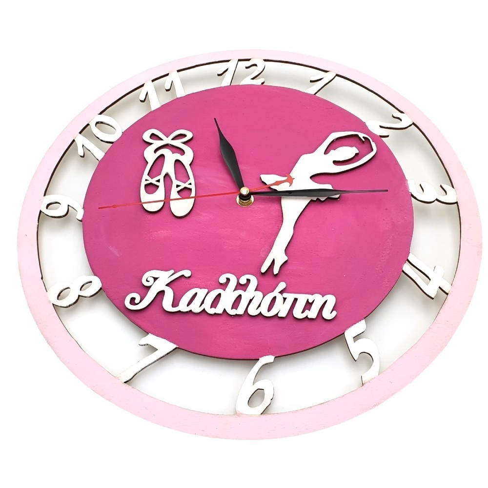 Μοναδικό ξύλινο παιδικό ρολόι σε θέμα μπαλαρίνα! Ένα ιδιαίτερο ρολόι σε στρόγγυλο σχήμα που περιμετρικά του έχουν προσαρμοστεί οι αριθμοί της ώρας, στο κέντρο του η φιγούρα μιας μπαλαρίνας, ένα ζευγάρι πουέντ και φυσικά το όνομα της επιλογής σας!
